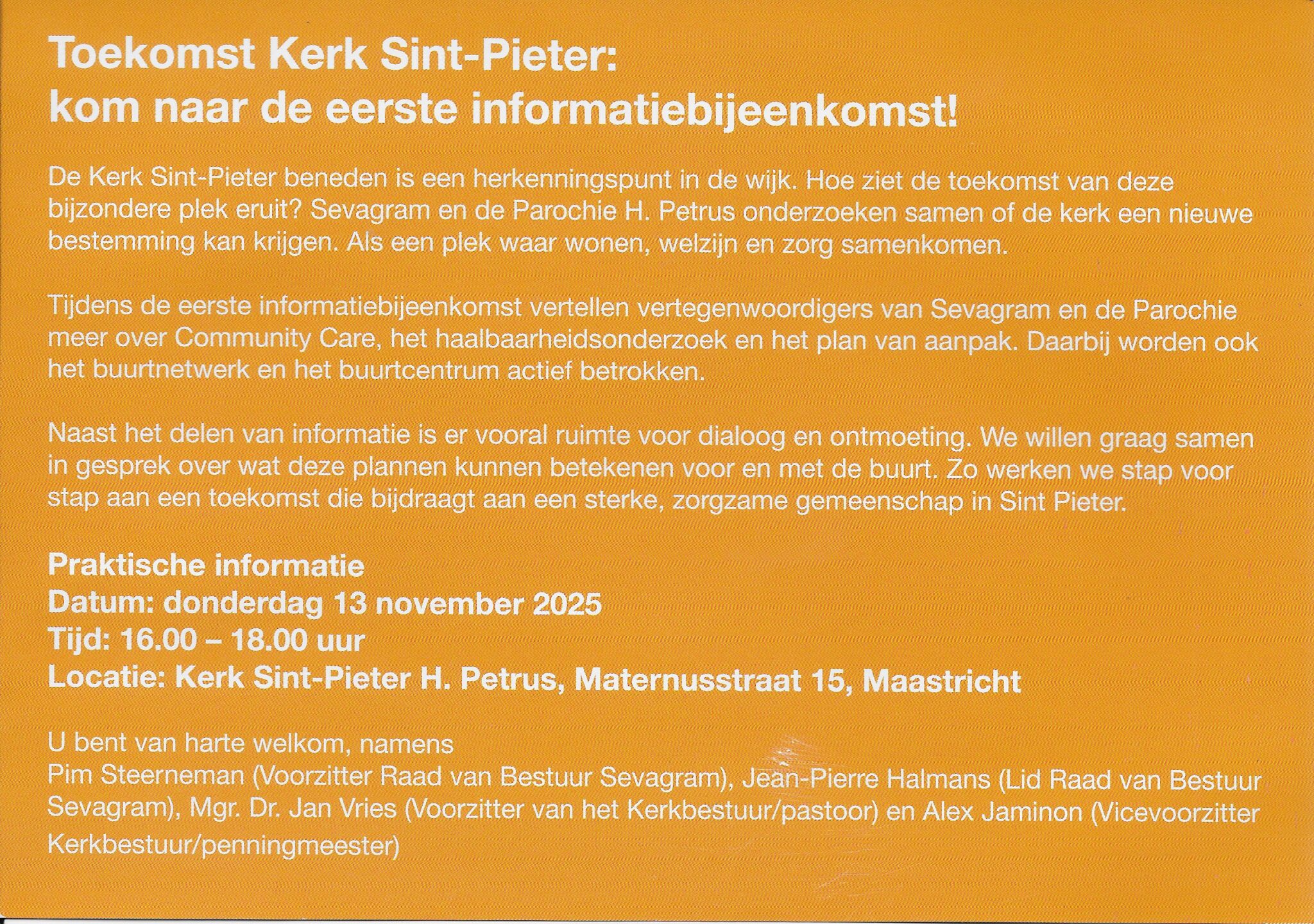 Op donderdag 13 november 2025 zijn alle buurtbewoners van 16:00 – 18:00 uur van harte uitgenodigd in de Kerk Sint Pieter Beneden (Maternusstraat 15) voor de eerste informatiebijeenkomst over de Toekomst van de Kerk Sint Pieter Beneden.