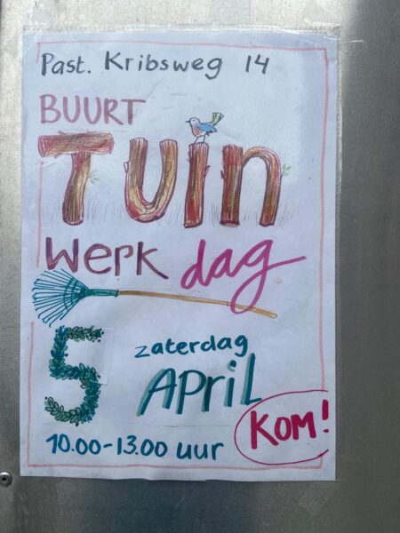 Opening tuinier seizoen 5 april 10.00-13.00 uur 20 maart 2025 Geen reacties Aarzel niet. Kom als je zin hebt in vegen, wieden, harken, planten, spitten, rotstuintjes aanleggen, bankjes bouwen van tegels, afkanten van de klauterboom-plek. Genoeg te doen! Kom als je buurtgenoten Lees verder »