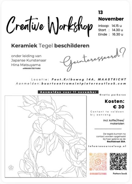 Op donderdag 13 november van 14.30 u tot 16.30 (vanaf 14.15u inloop) wordt onder leiding van de Japanse kunstenaar Hina Matsuyama een creatieve workshop ’tegel’ beschilderen gehouden.