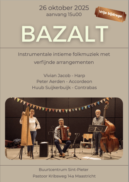 Op zondag 26 oktober 15:00 – 17:00 uur: Optreden van BAZALT met folkmuziek in Buurtcentrum Sint Pieter
