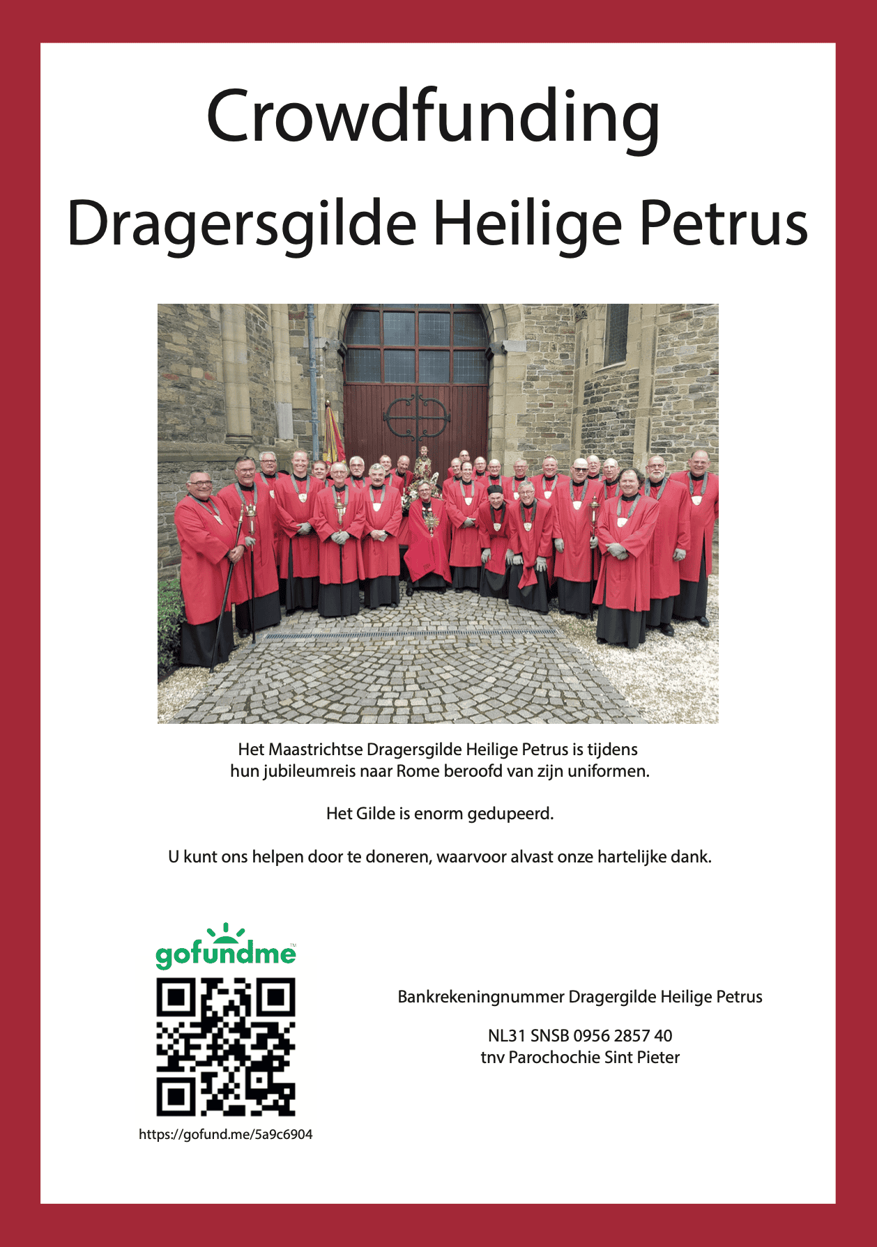 Als het Gilde in 2025 wederom deelneemt aan de Heiligdomsvaart in Maastricht willen wij dat graag in onze kenmerkende rode Petruskleur doen. We zitten niet stil en proberen op alle mogelijke manieren aan voldoende budget te komen om nieuwe tenues te laten maken.
