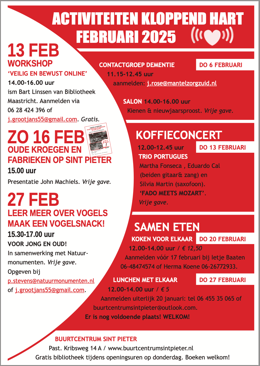 Hierbij het programma van Kloppend Hart Sint Pieter van de maand februari 2025. De activiteiten van Kloppend Hart Sint Pieter vinden uiteraard plaats in het Buurtcentrum Sint Pieter, Pastoor Kribsweg 14A.