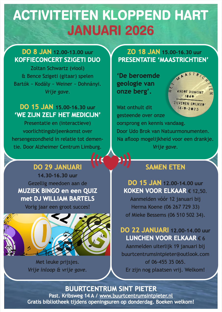 Hierbij het programma van Kloppend Hart Sint Pieter van de maand januari 2026. De activiteiten van Kloppend Hart Sint Pieter vinden uiteraard plaats in het Buurtcentrum Sint Pieter, Pastoor Kribsweg 14A.