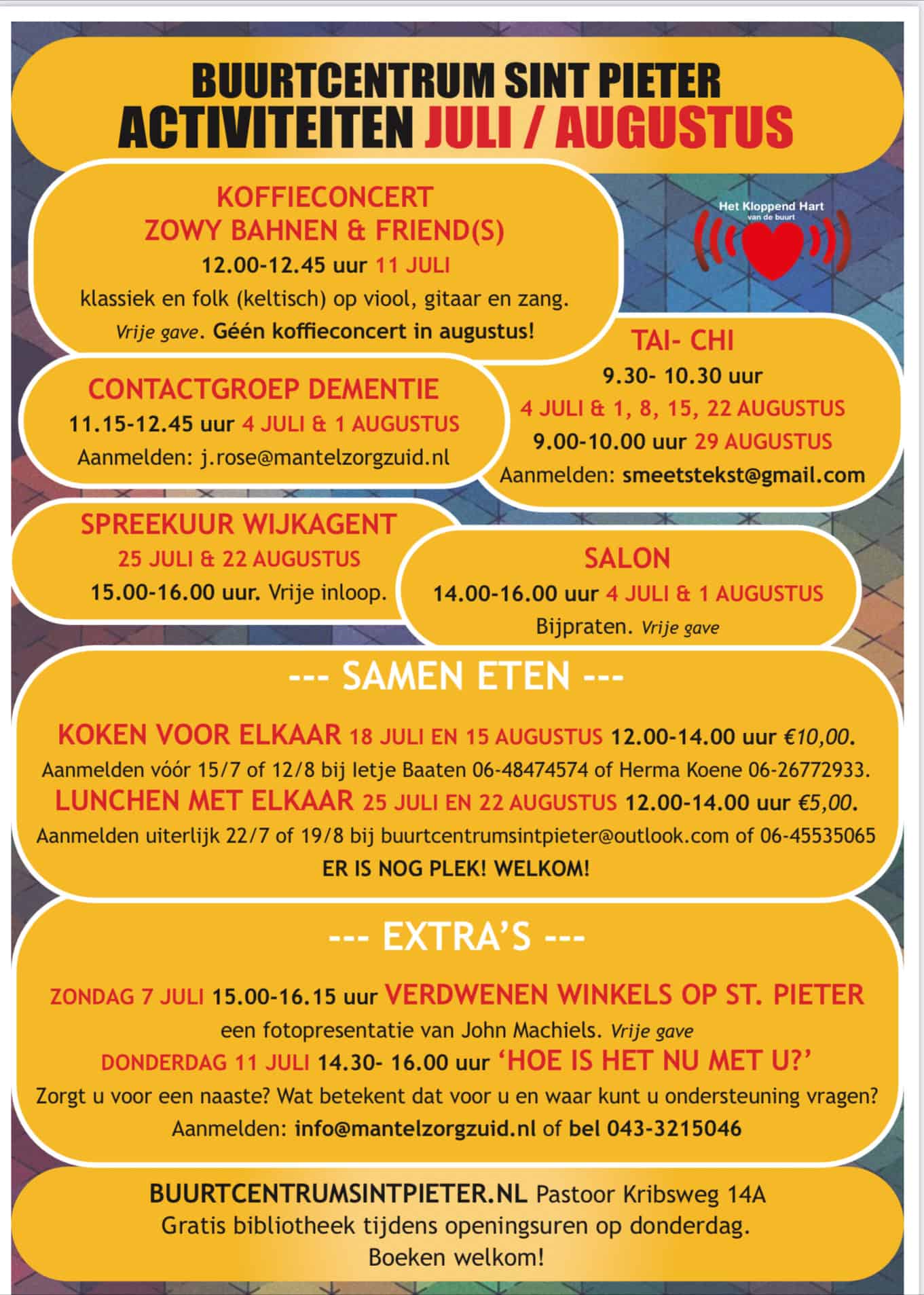 Hierbij het programma van Kloppend Hart Sint Pieter van de maanden juli – augustus 2024. De activiteiten van Kloppend Hart Sint Pieter vinden uiteraard plaats in het Buurtcentrum Sint Pieter, Pastoor Kribsweg 14A.