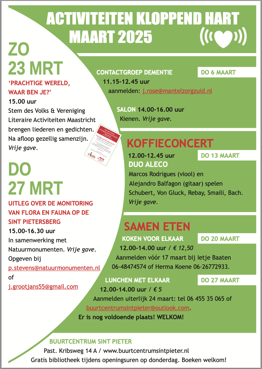 Hierbij het programma van Kloppend Hart Sint Pieter van de maand maart 2025. De activiteiten van Kloppend Hart Sint Pieter vinden uiteraard plaats in het Buurtcentrum Sint Pieter, Pastoor Kribsweg 14A.
