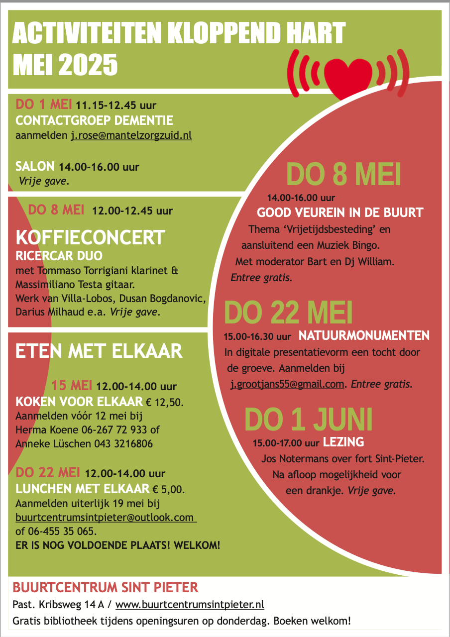 Hierbij het programma van Kloppend Hart Sint Pieter van de maand mei 2025. De activiteiten van Kloppend Hart Sint Pieter vinden uiteraard plaats in het Buurtcentrum Sint Pieter, Pastoor Kribsweg 14A.