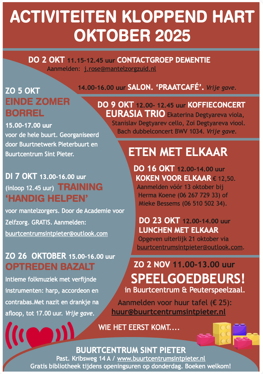 Hierbij het programma van Kloppend Hart Sint Pieter van de maand oktober 2025. De activiteiten van Kloppend Hart Sint Pieter vinden uiteraard plaats in het Buurtcentrum Sint Pieter, Pastoor Kribsweg 14A.