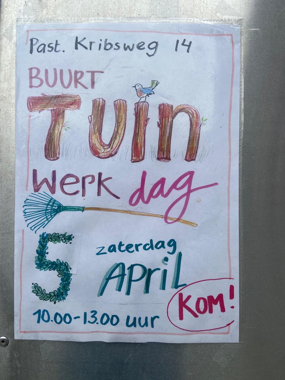 Aarzel niet. Kom als je zin hebt in vegen, wieden, harken, planten, spitten, rotstuintjes aanleggen, bankjes bouwen van tegels, afkanten