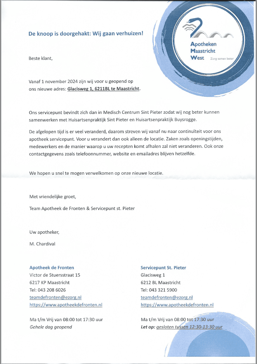 Vanaf 1 november 2024 verhuist het Servicepunt Apotheek St. Pieter naar het Medisch Centrum Sint Pieter aan de Glacisweg 1.