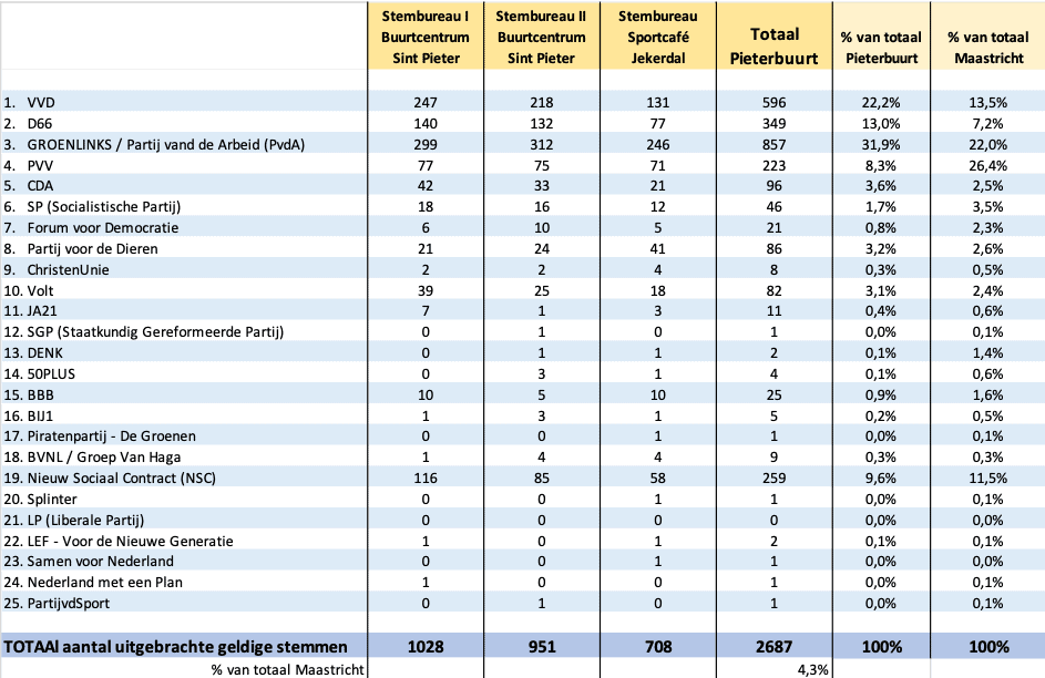 In totaal Maastricht kwam PVV als grootste eruit (26%), gevolgd door GROENLINKS / PvdA (22%), VVD (13,5%), NSC (11,5%) en D66 (7%).